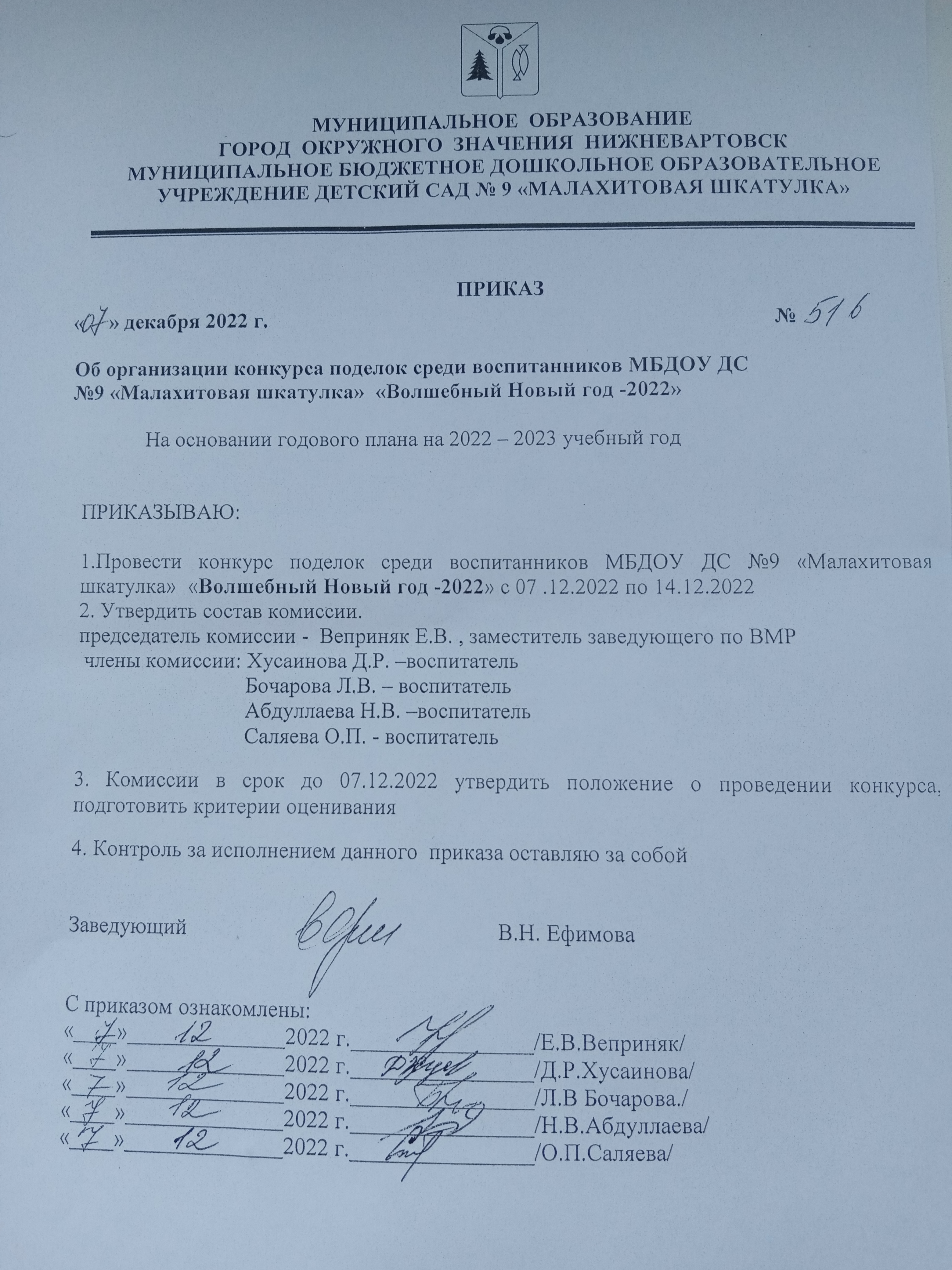 2022, Приказ об организации конкурса поделок среди воспитанников ДОУ "Волшебный Новый год-2022"(член экспертной комиссии)