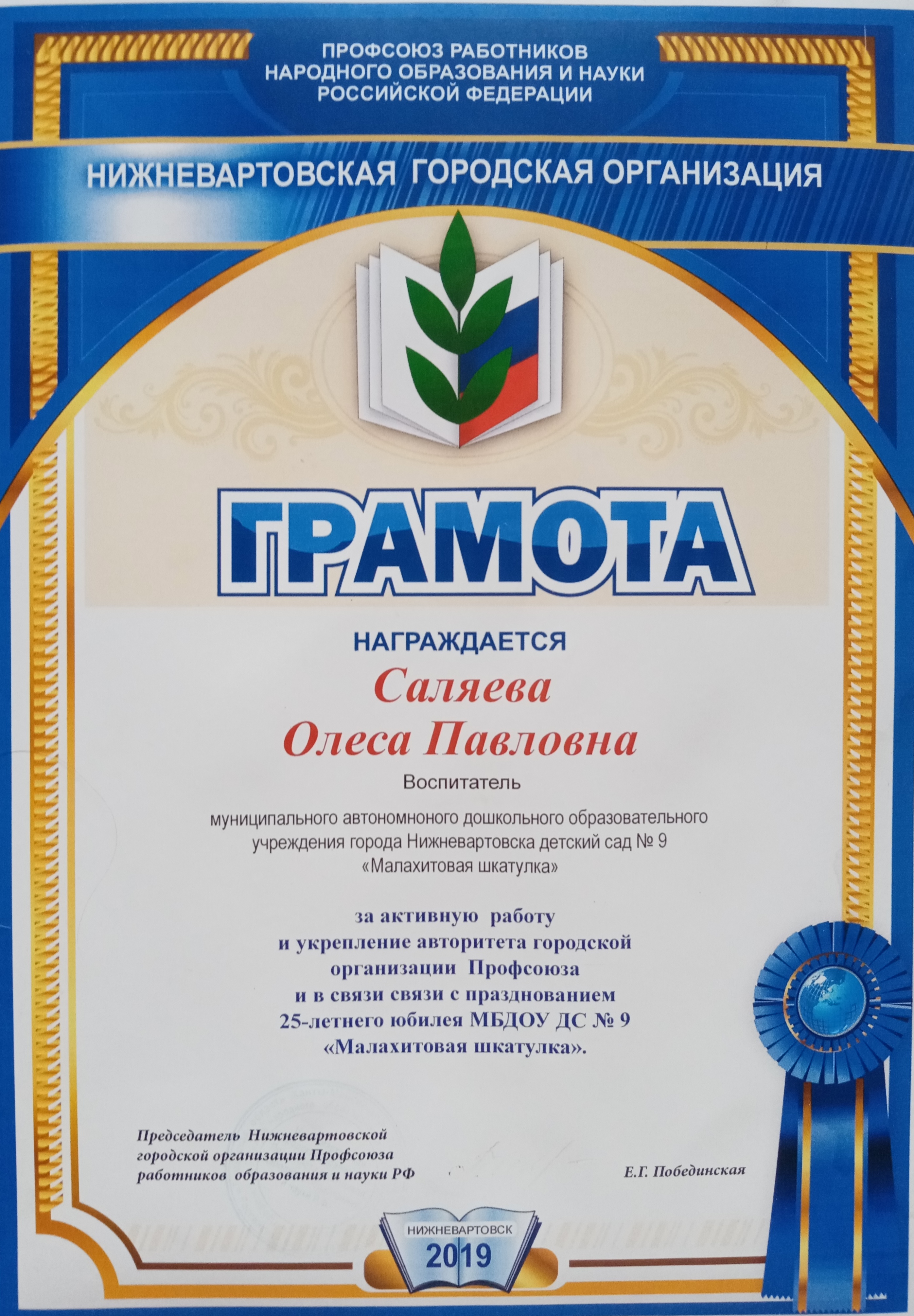 2019, Грамота за активную работу и укрепление авторитета городской организации Профсоюза и в связи с празднованием 25-летнего юбилея МБДОУ ДС №9 "Малахитовая шкатулка"