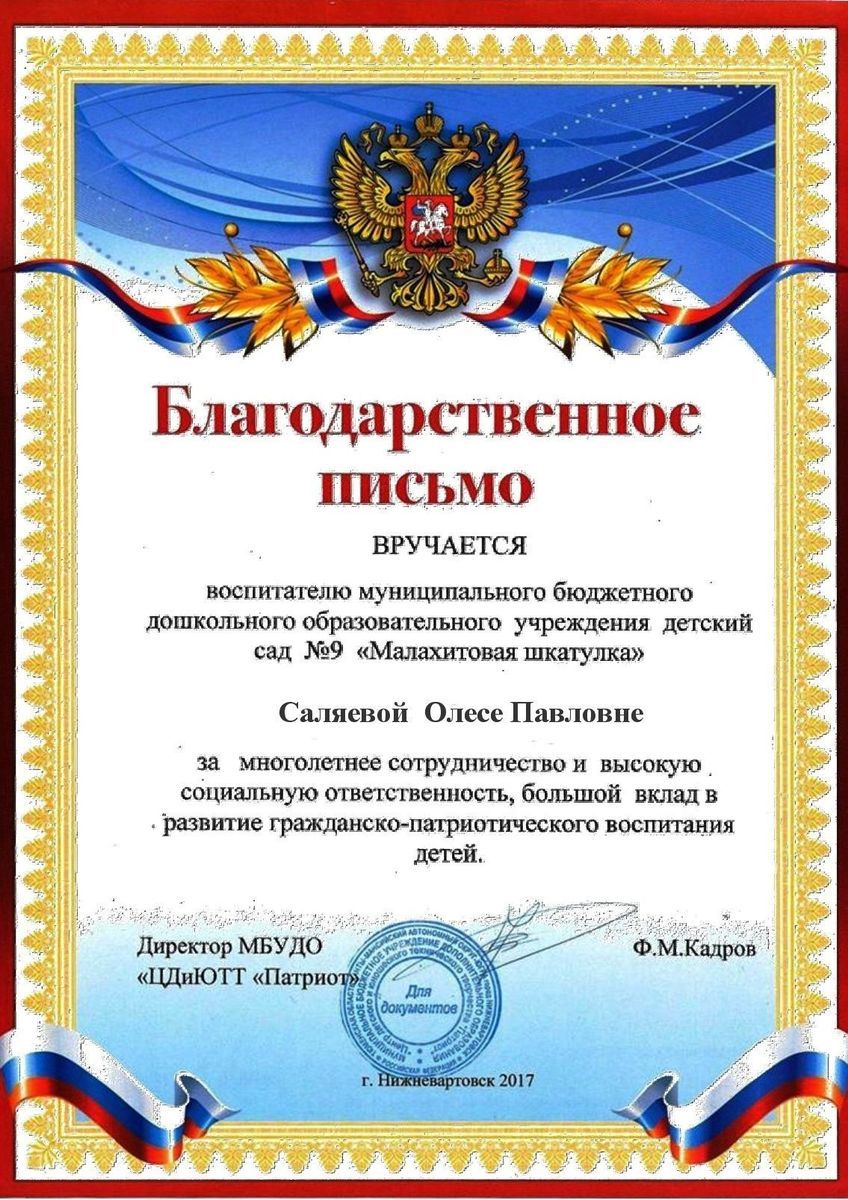 2017, Благодарственное письмо за многолетнее сотрудничество и высокую социальную ответственность, большой вклад в развитие гражданско-патриотического воспитания детей от МБУДО "ЦДиЮТТ "Патриот"